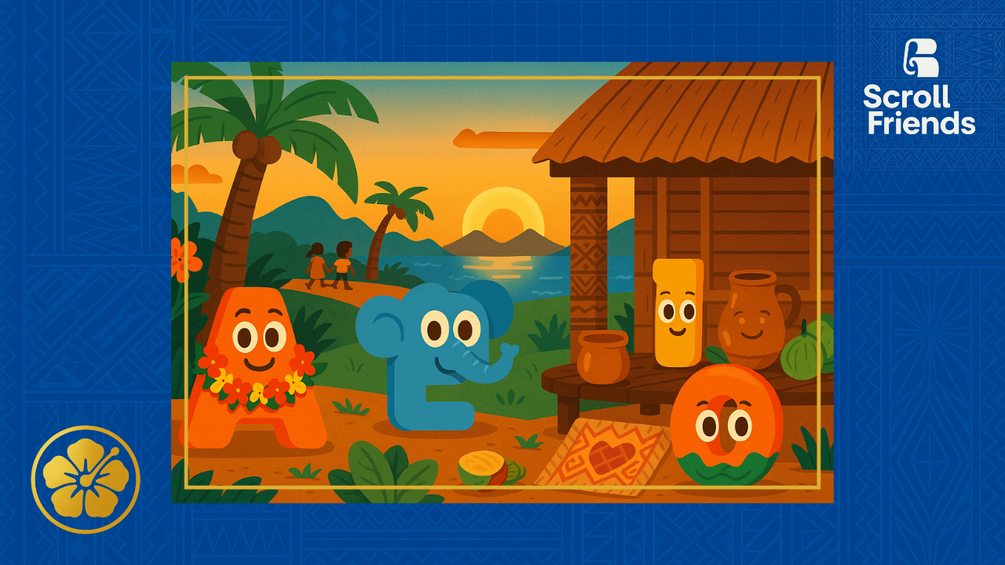 The first ScrollFriends™ guardians — A, E, I, O — brought to life in a premium illustrated print.